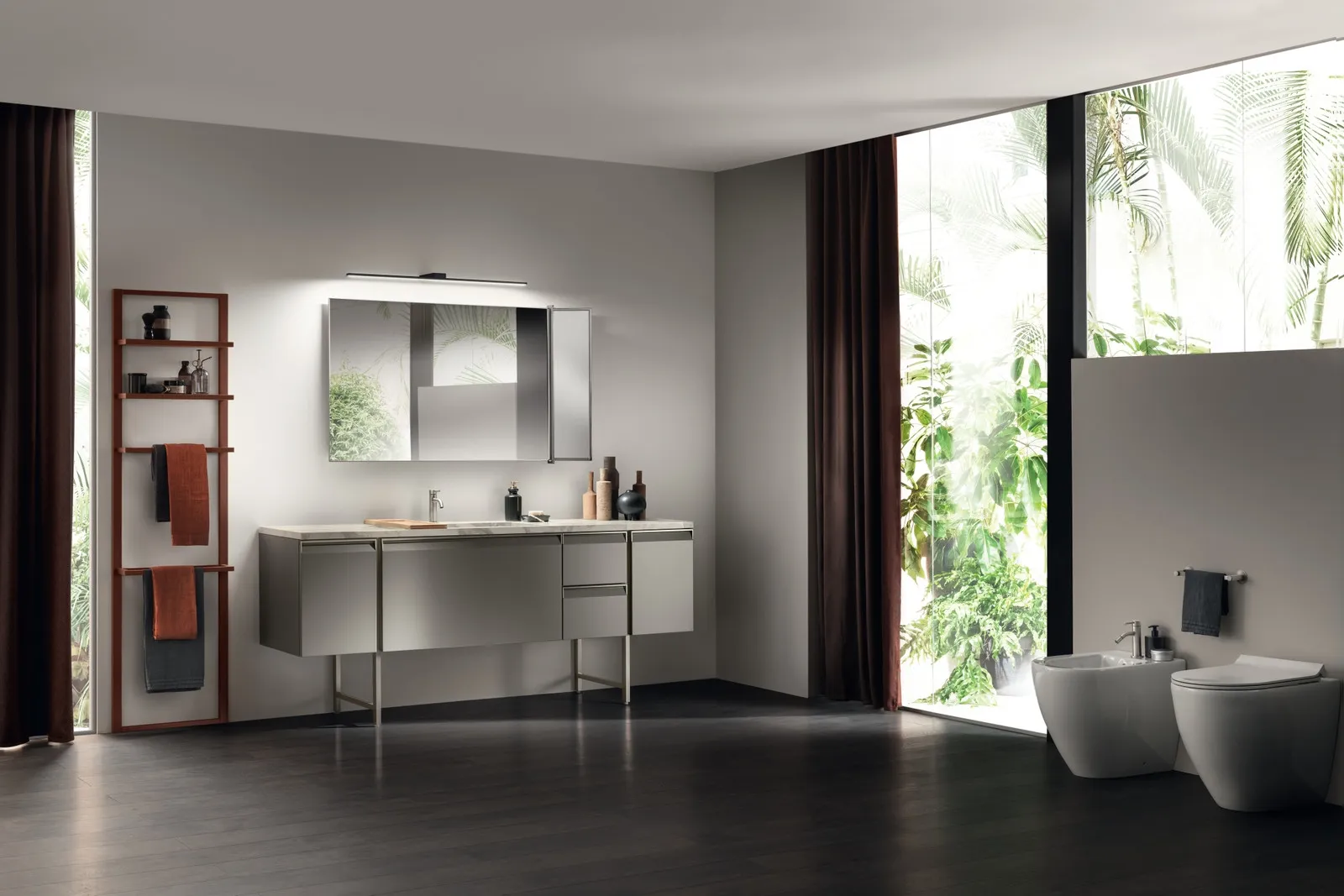 Scopri di più sull'arredo bagno moderno: mobili bagno a terra in laccato opaco come il modello Formalia Laccato Opaco Titanio di Scavolini Bathrooms ti attendono.