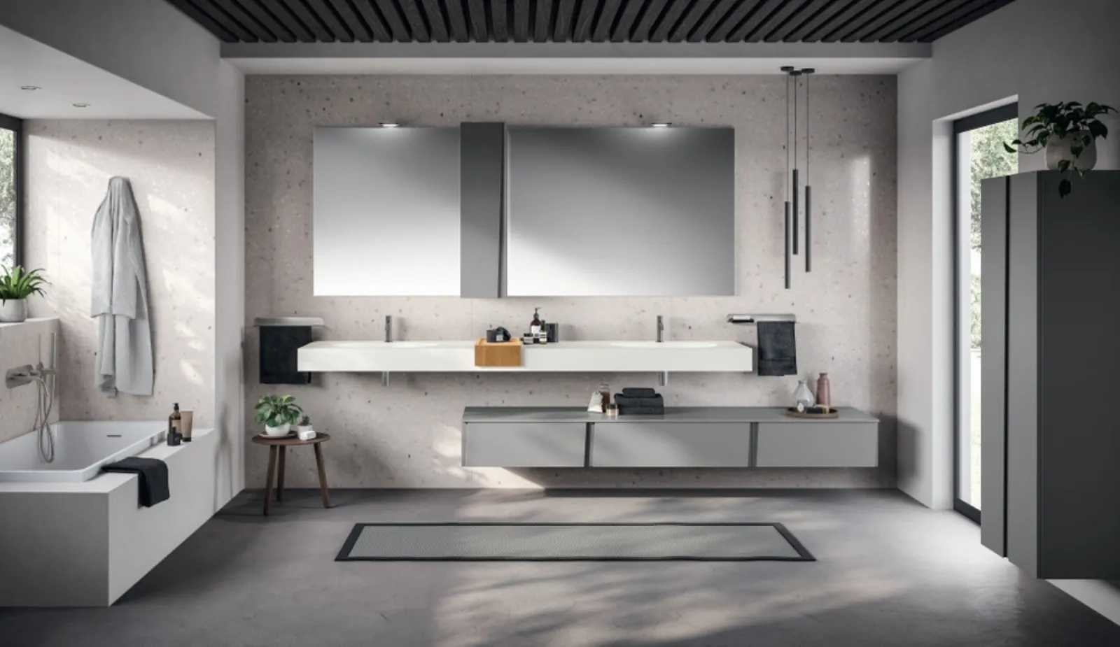 Ottieni informazioni sull'arredo bagno moderno: mobili bagno sospesi in laccato opaco come il modello Lagu Laccato Opaco Grigio Vulcano di Scavolini Bathrooms ti attendono.