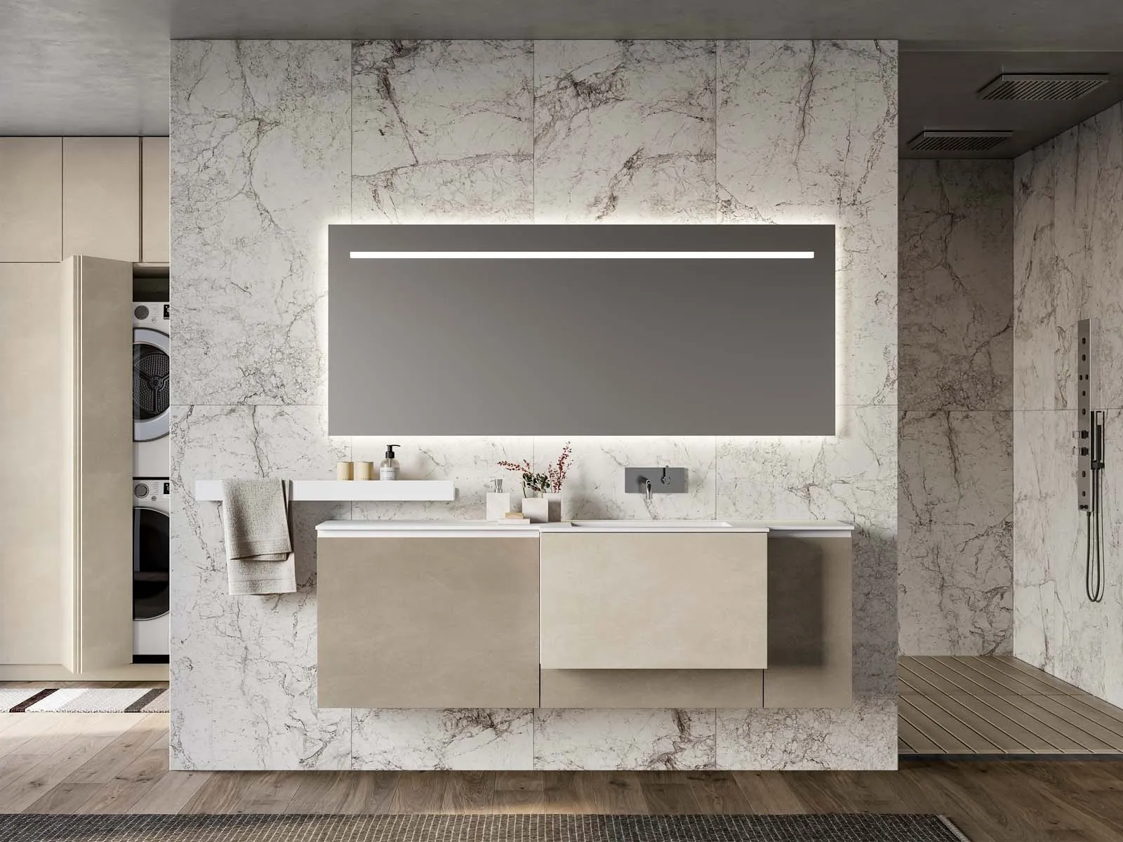 Mobili bagno sospesi in melaminico della marca Birex: clicca e scopri l'arredo bagno moderno Lapis 07 per la stanza del benessere.