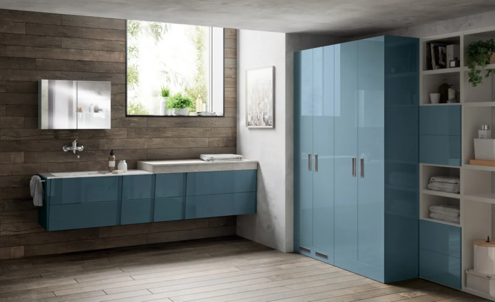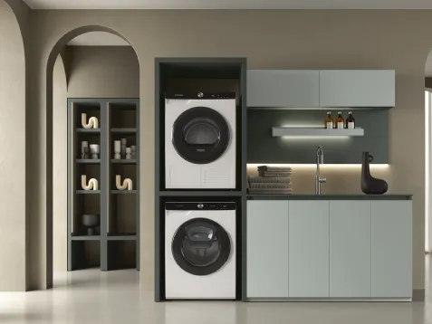 Arreda il bagno di casa moderno al meglio con Laundry Space Lagu Verde Ottanio, mobili bagno per lavanderia e accessori in laccato lucido di Scavolini Bathrooms.