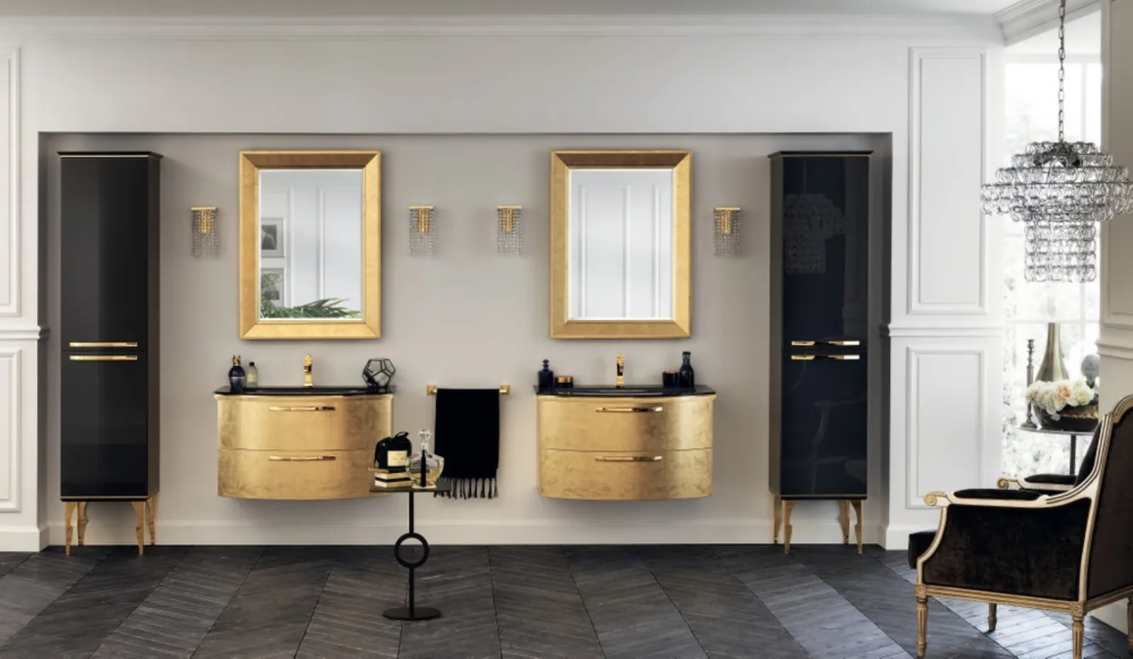 Mobili bagno sospesi Magnifica Laccato Lucido Foglia Oro di Scavolini Bathrooms: scopri l'Arredo Bagno in laccato lucido design e arreda la stanza del benessere.
