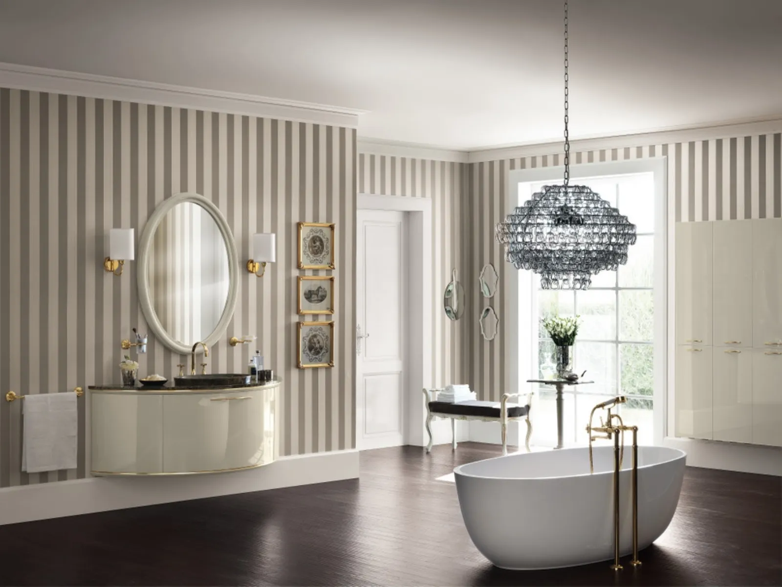 Mobili bagno sospesi in laccato lucido della marca Scavolini Bathrooms: clicca e scopri l'arredo bagno design Magnifica Laccato Lucido Tortora e Oro per il bagno di casa.