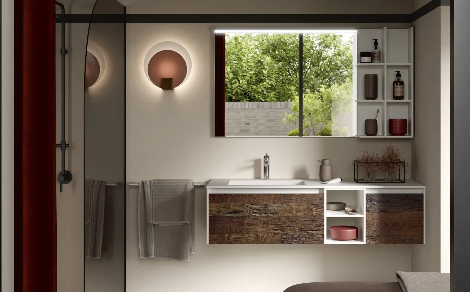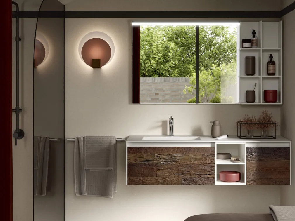 Mobili bagno sospesi in legno della marca Rab Arredobagno: clicca e scopri l'arredo bagno moderno Soul Wood 113 per la stanza del benessere.