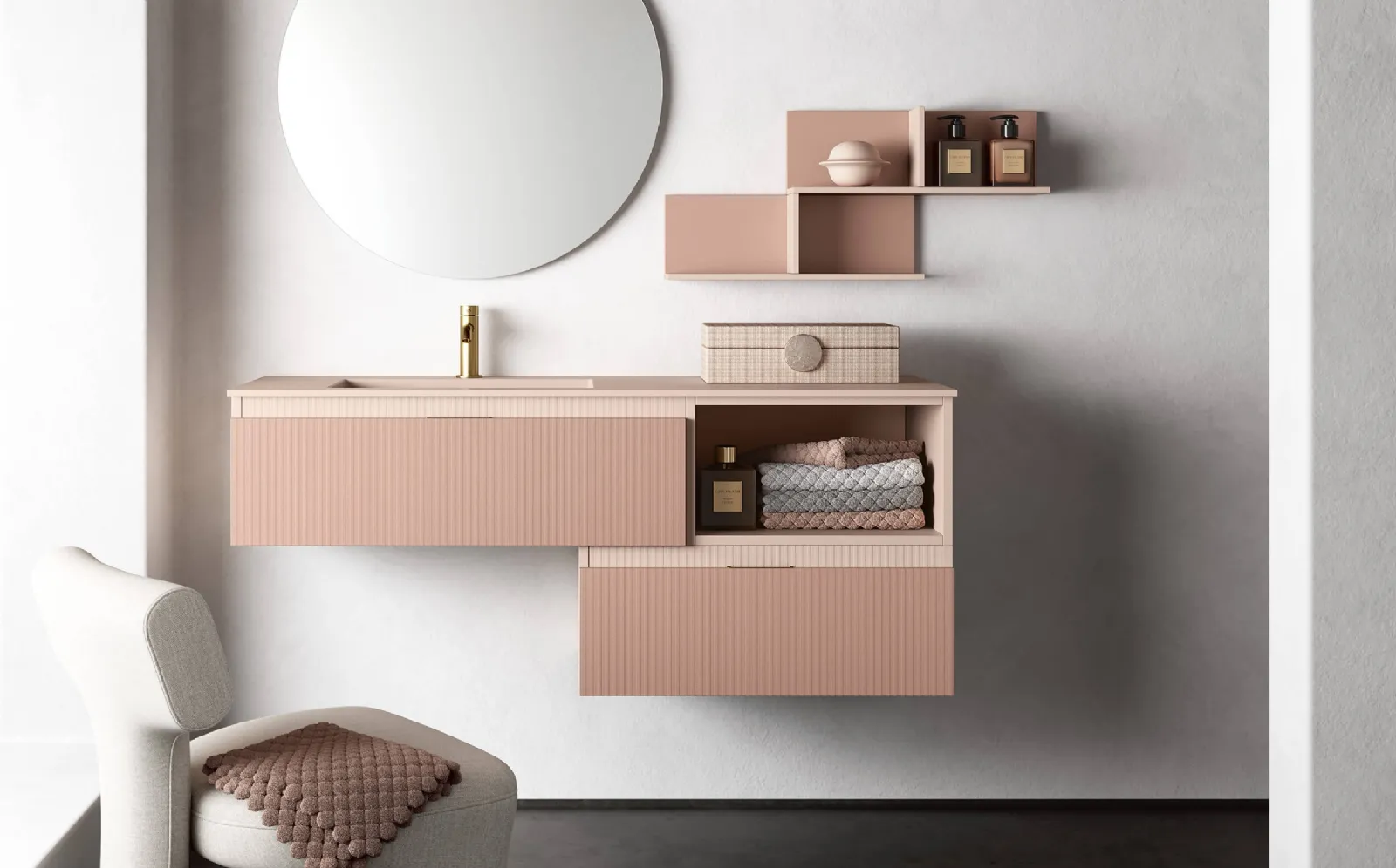Mobili bagno sospesi in laccato opaco del marchio Rab Arredobagno: clicca e scopri l'arredo bagno moderno Step 100 per la stanza del benessere.