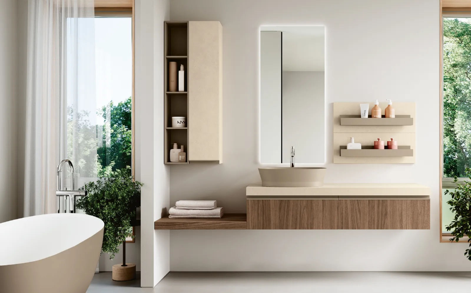mobili bagno sospesi in melaminico dell'azienda Rab Arredobagno: clicca e scopri l'arredo bagno moderno Thai 401 per il bagno di casa.