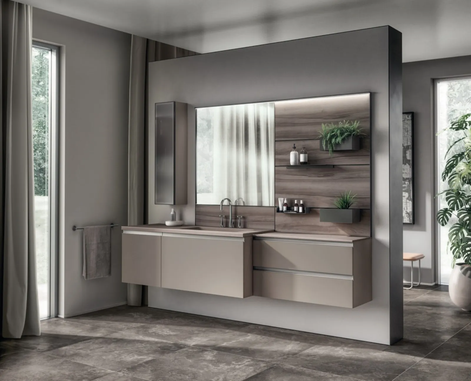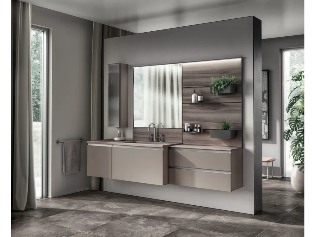 Scopri di più sull'arredo bagno moderno: mobili bagno sospesi in melaminico come il modello Tratto Decorativo Grigio Selce di Scavolini Bathrooms ti attendono.