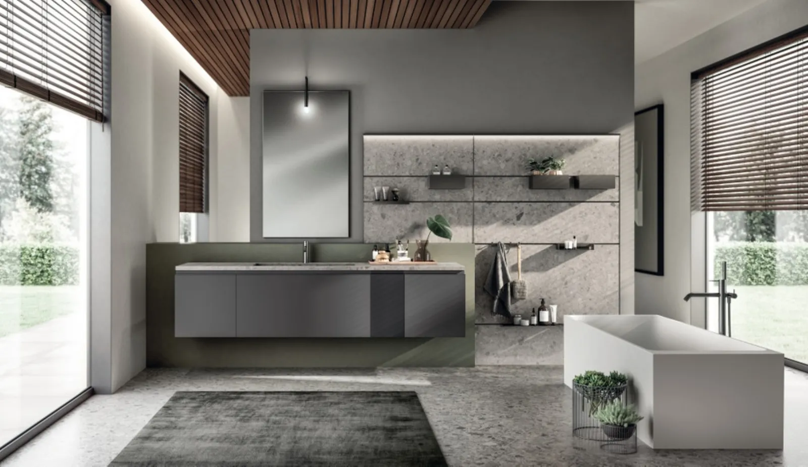 Arreda il tuo bagno moderno alla perfezione con Tratto Laccato Opaco Grigio Ferro, mobili bagno sospesi e complementi in laccato opaco di Scavolini Bathrooms.