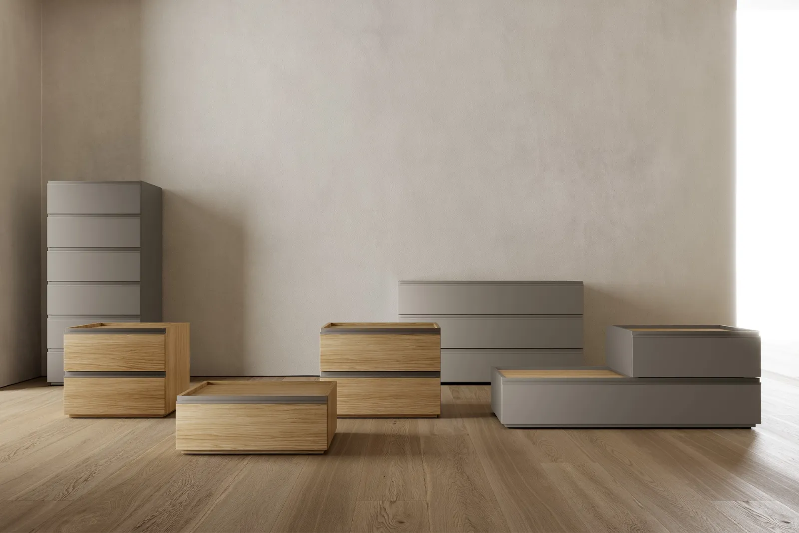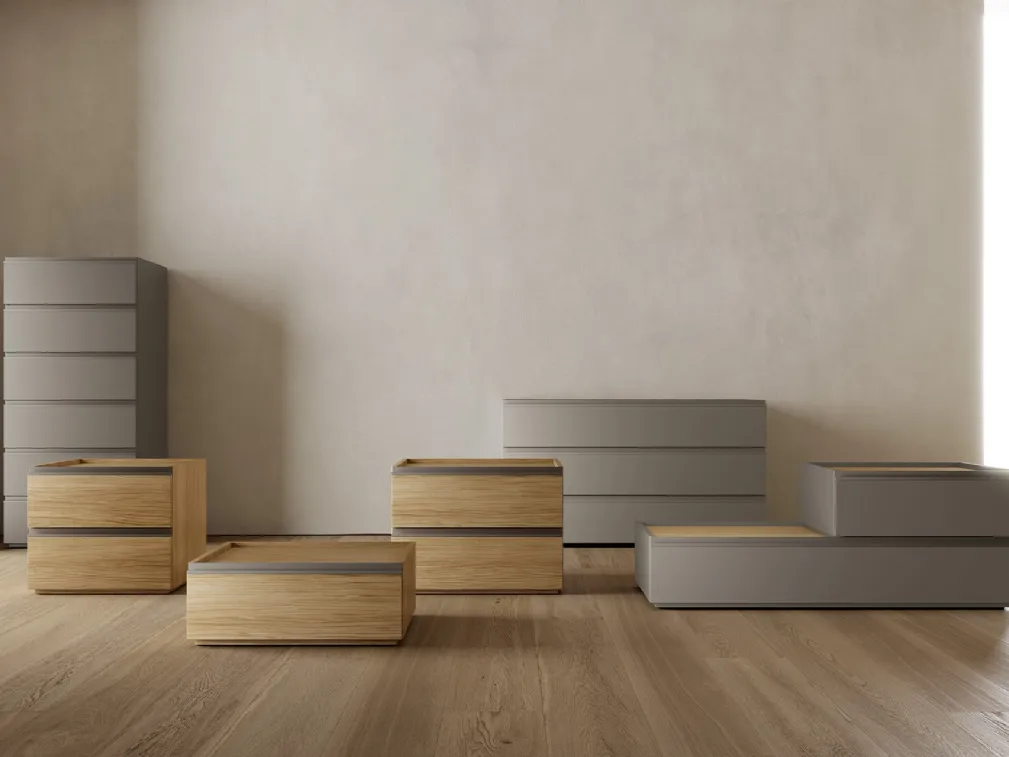 Vuoi progettare la camera da letto con Comodini e mobili con cassetti di SantaLucia? Ecco qui il modello Sistema Modo Gruppo Notte in melaminico per spazi moderni.
