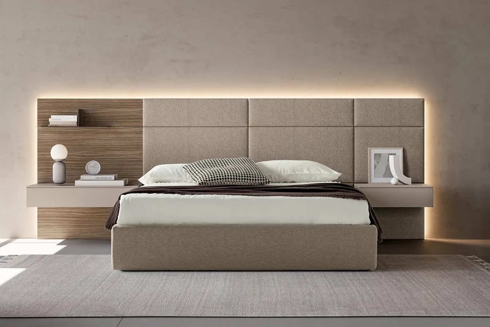 Se sei alla ricerca di letti matrimoniali con contenitore, eccoti il modello Modula con contenitore in tessuto per completare la zona notte.