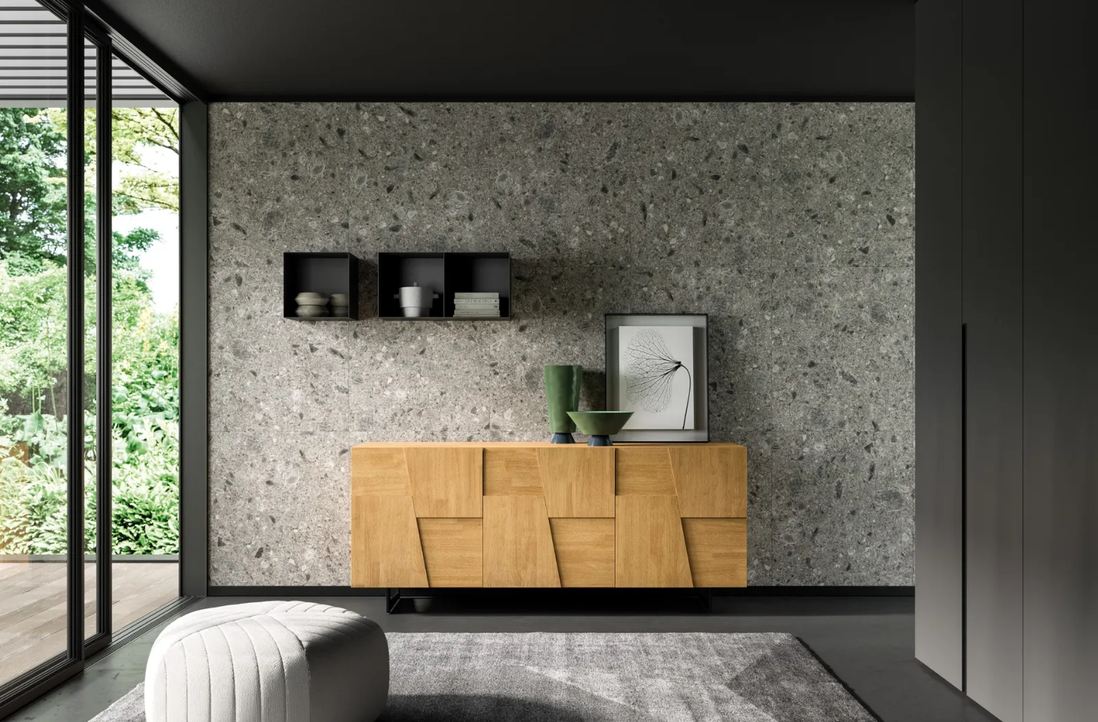 Arreda un living dinamico e operativo con questa madia Trapeze tre ante di FGF Mobili: scopri le più belle Madie in legno.