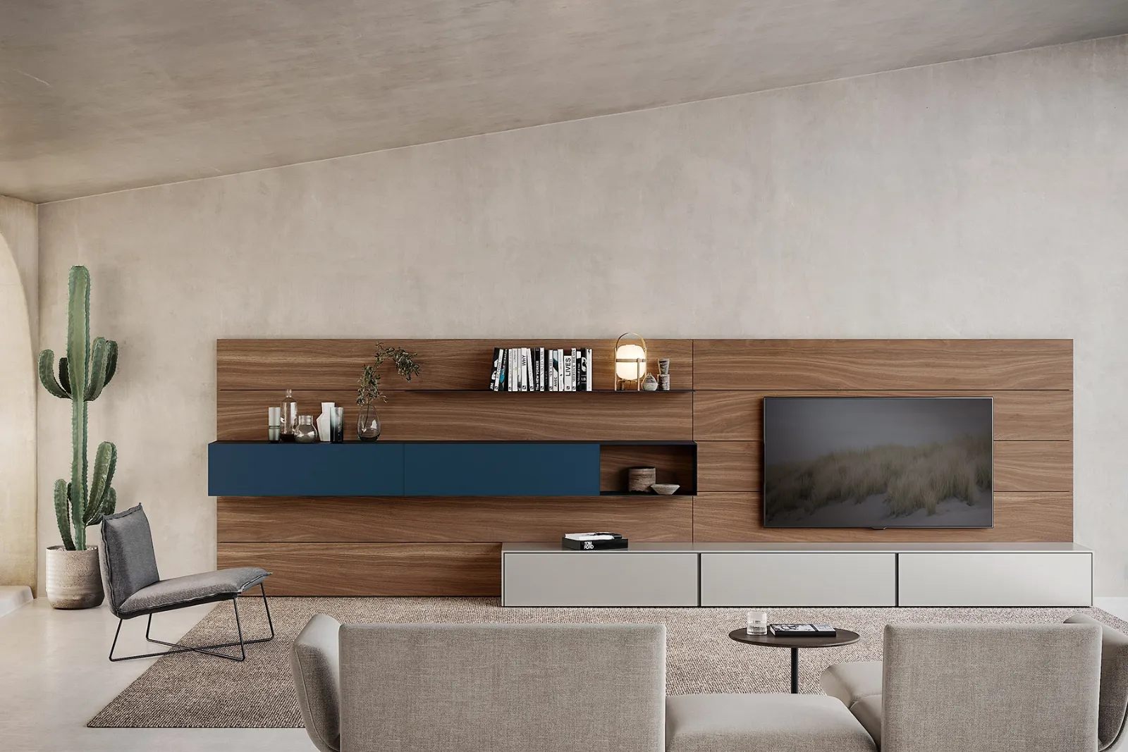 Vuoi progettare un soggiorno operativo e pratico? Ti offriamo la parete attrezzata Avenue 01 Md House dalle forme decise moderne.