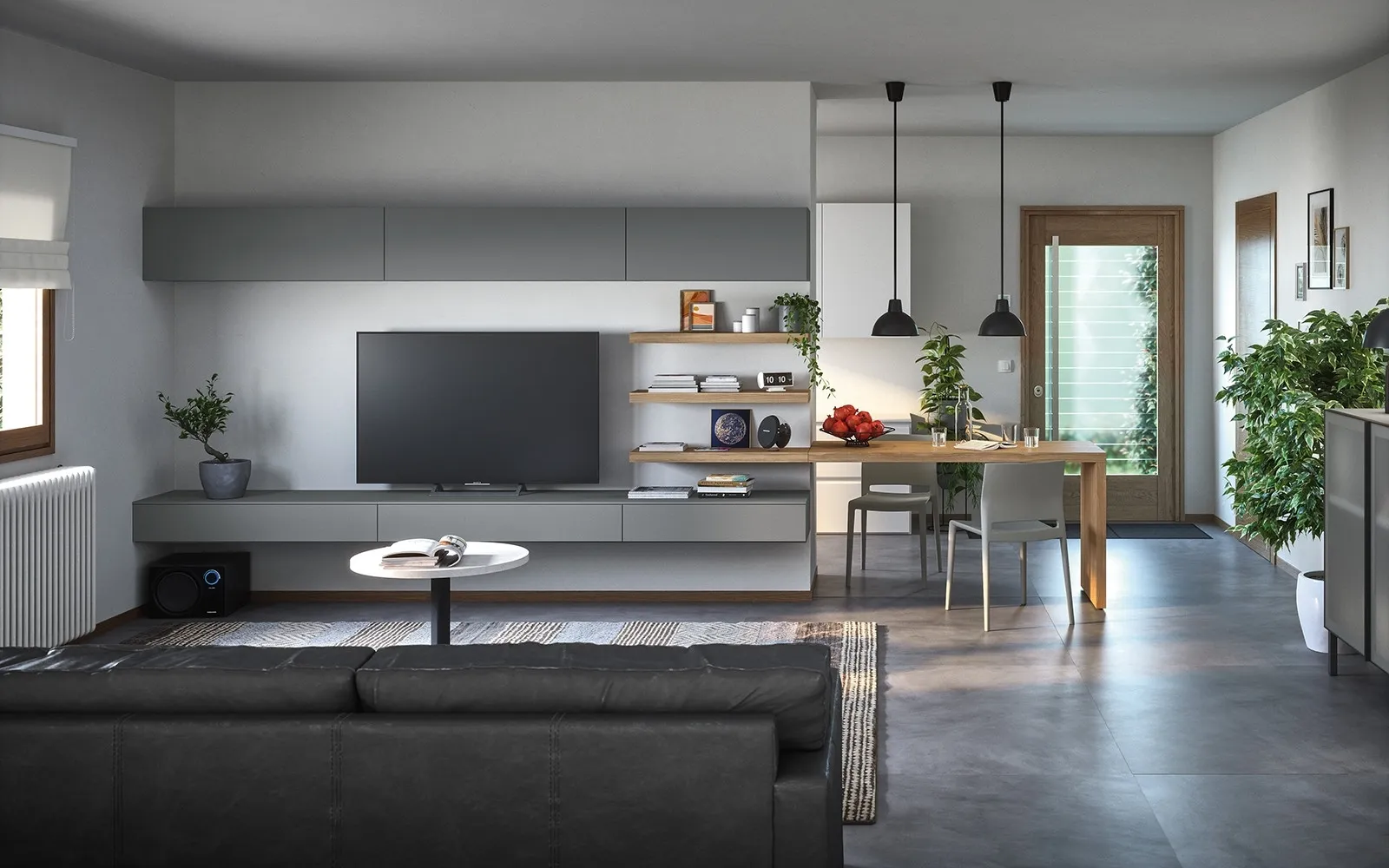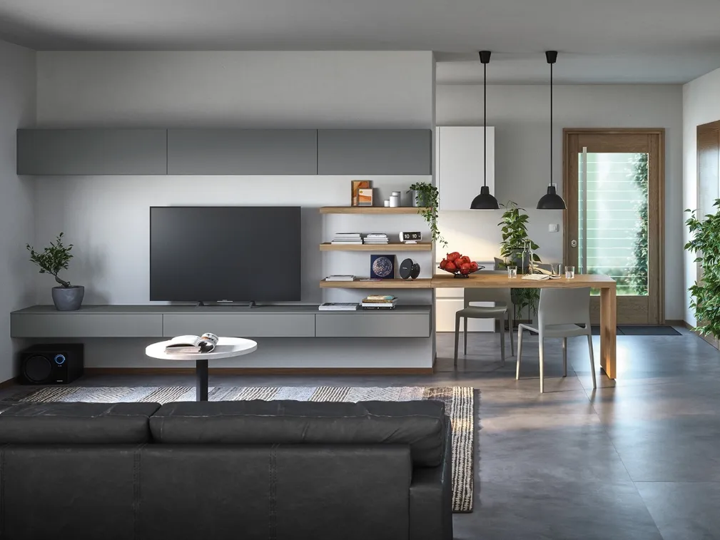 Vuoi arredare un living pratico e dinamico? Ti presentiamo la parete attrezzata Parete Attrezzata 04E Cinquanta3 dalle forme decise moderne.