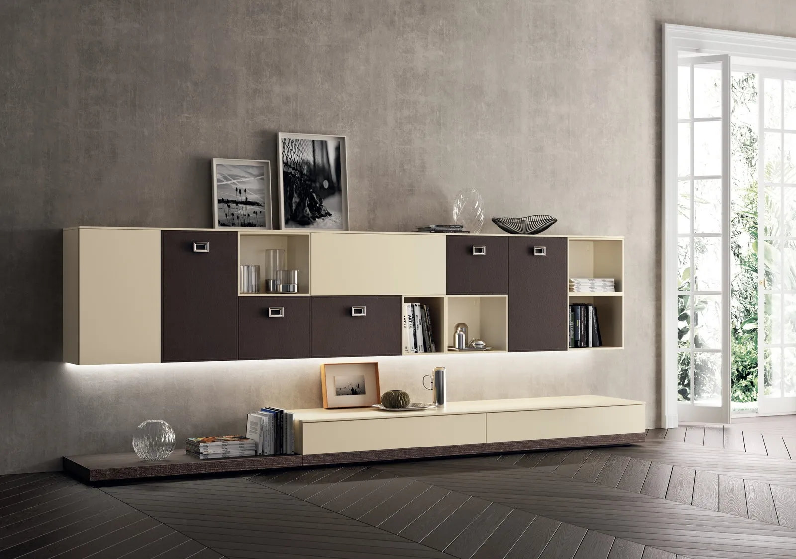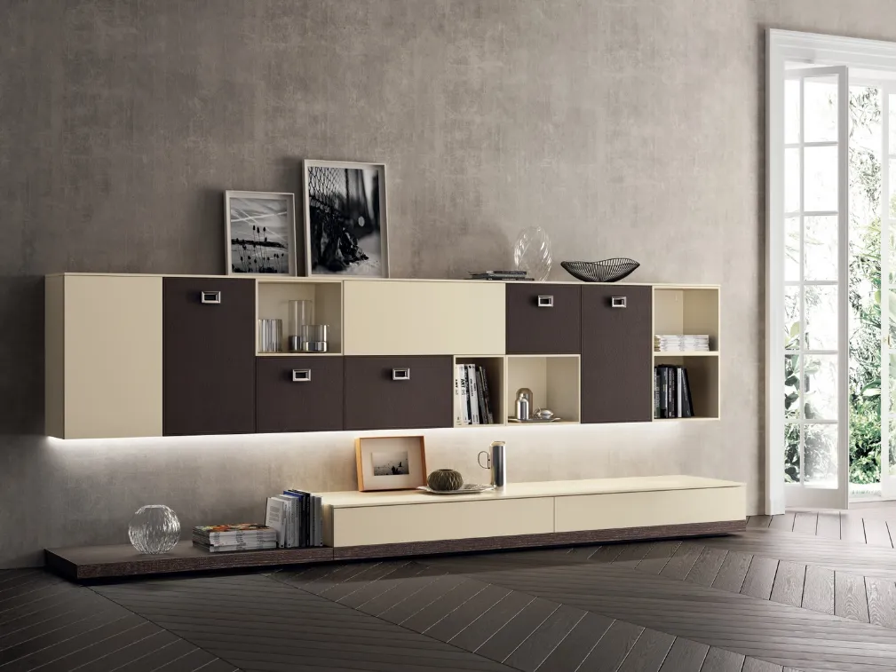 Clicca e scopri di più sulla parete attrezzata Living Exclusiva Beige e Pelle Ebano della marca Scavolini: è la soluzione dalle linee moderne perfetta per te.