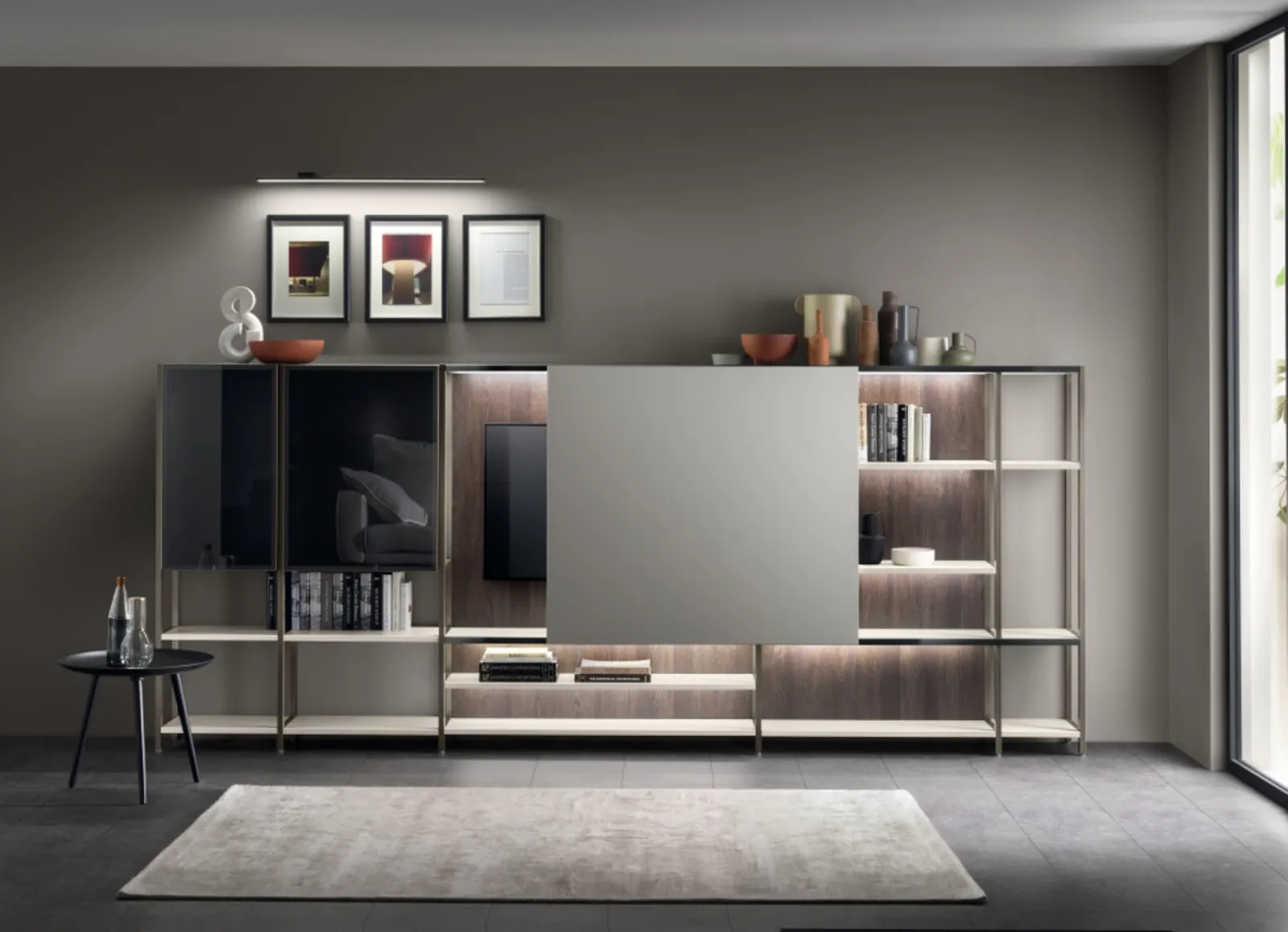 Pareti attrezzate e mobili soggiorno Scavolini: clicca e scopri il modello Living Formalia con Anta scorrevole in Pet Pioggia e potrai arricchire stanze moderne di ogni genere.