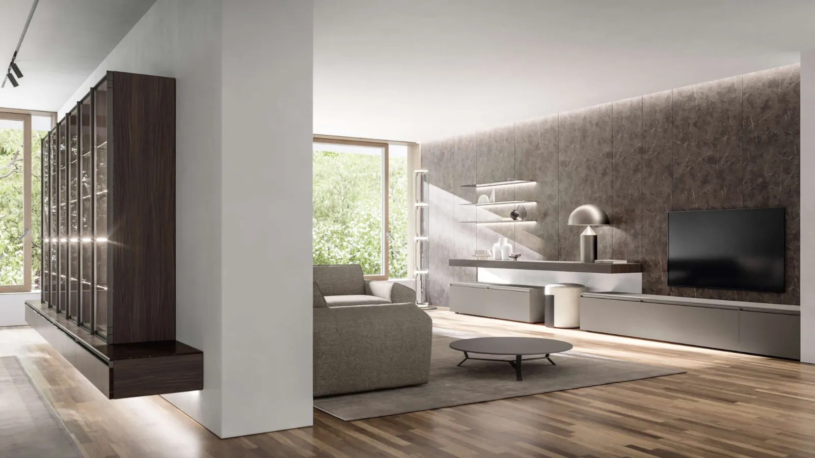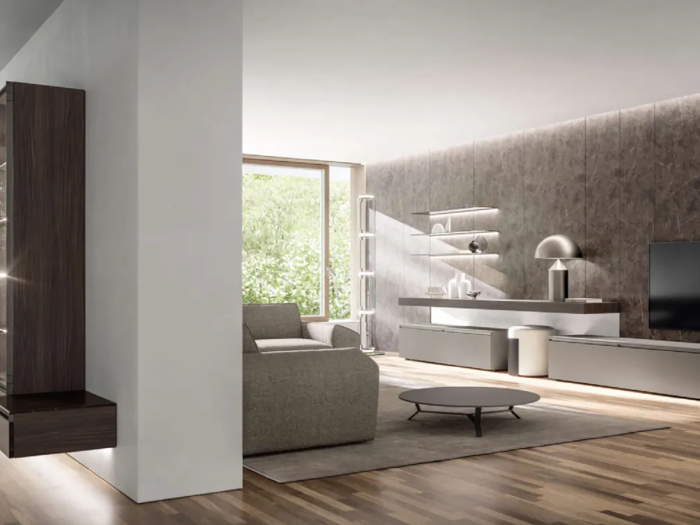 Se vuoi ultimare un soggiorno operativo e pratico dalle linee moderne, ti presentiamo la parete attrezzata Location 19 SantaLucia.