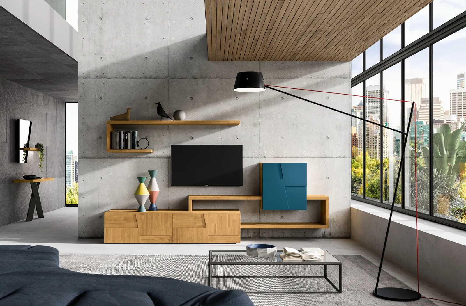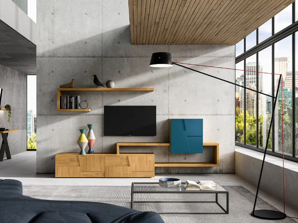 Vuoi progettare un soggiorno dinamico e operativo? Ecco a te la parete attrezzata Mixer 08 FGF Mobili dalle linee decise moderne.