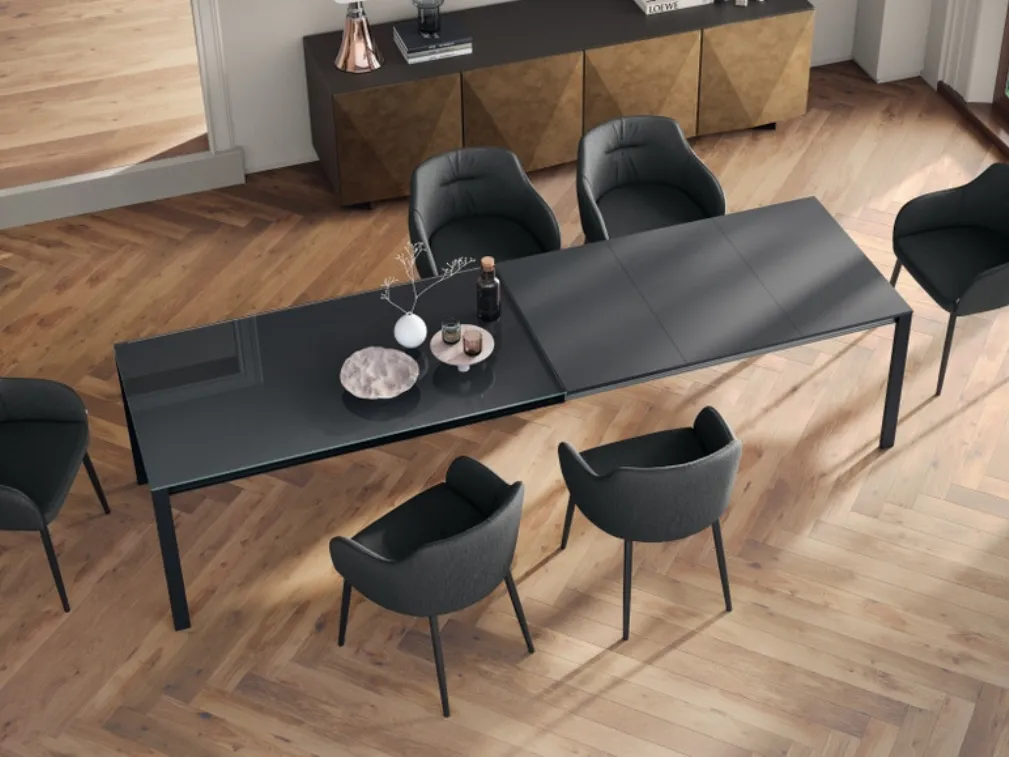 Se vuoi tavoli allungabili moderni, ti presentiamo il modello da pranzo in vetro Dimension della firma Scavolini.