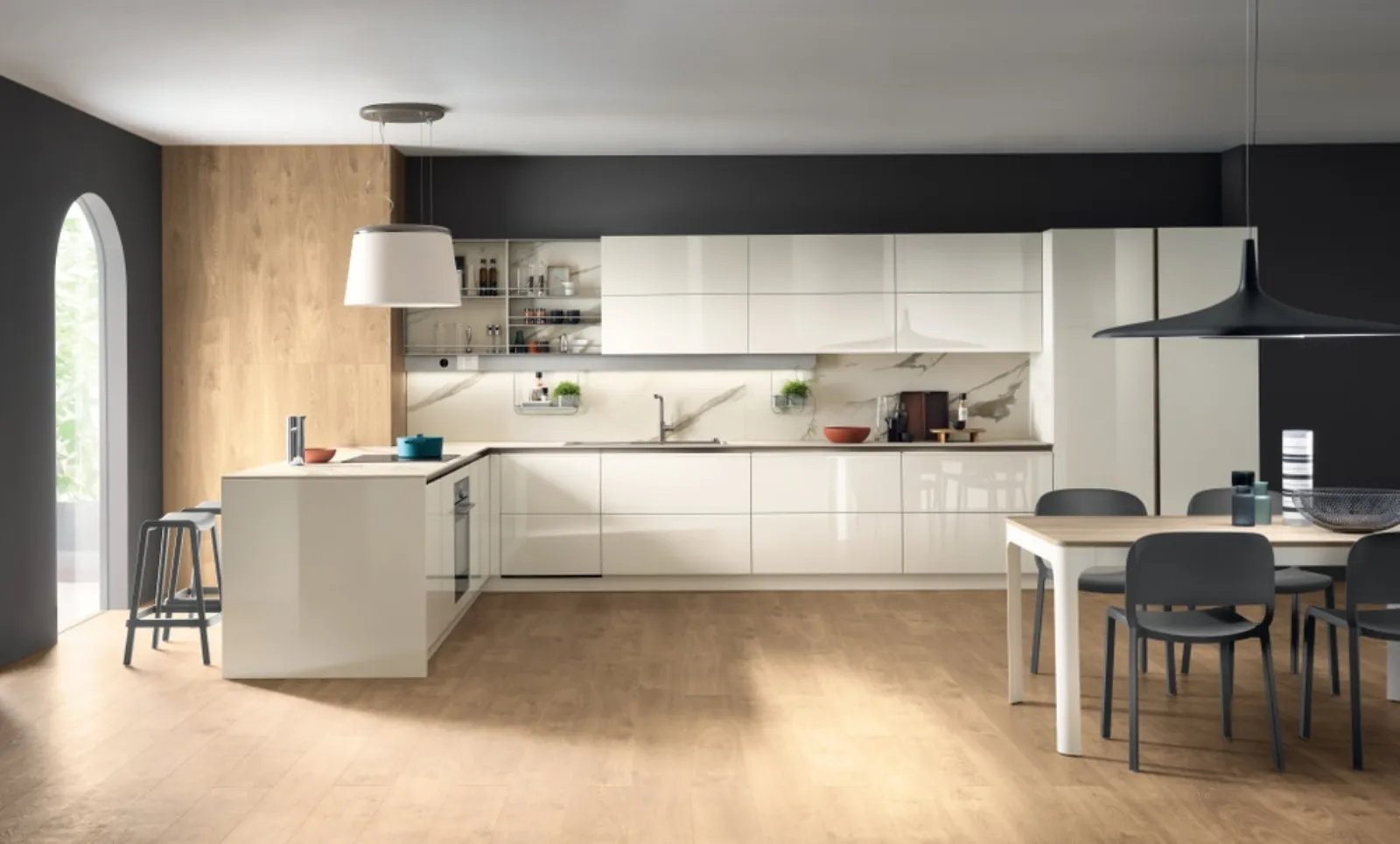 Cucine Moderne con penisola: clicca e scopri una ricca gamma di soluzioni del brand Scavolini, tra cui il modello Dandy Plus Bianca Lucida.