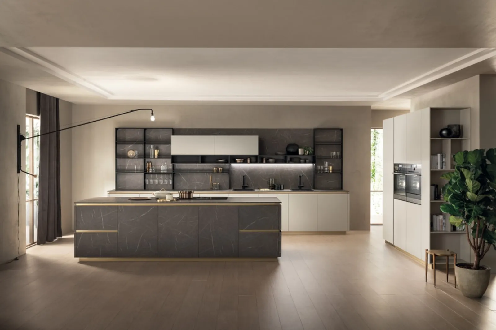Clicca e scopri un mondo di Cucine Moderne con isola: la cucina DeLinea in Pietra Grey e Grigio Chiaro opaco Scavolini in laminato ti attende!