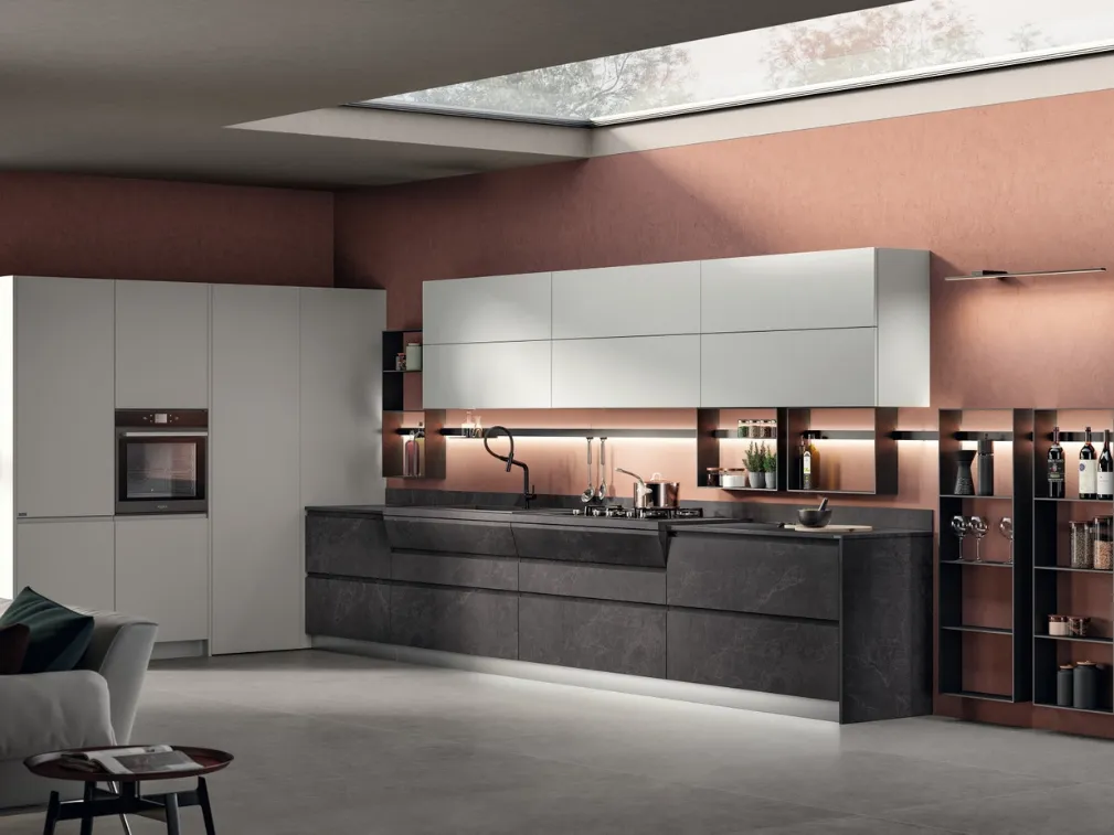Cucine Moderne ad angolo: clicca e scopri una ricca gamma di soluzioni del marchio Scavolini, tra cui il modello Motus in Pietra Abyss e laccato opaco Grigio Airone.