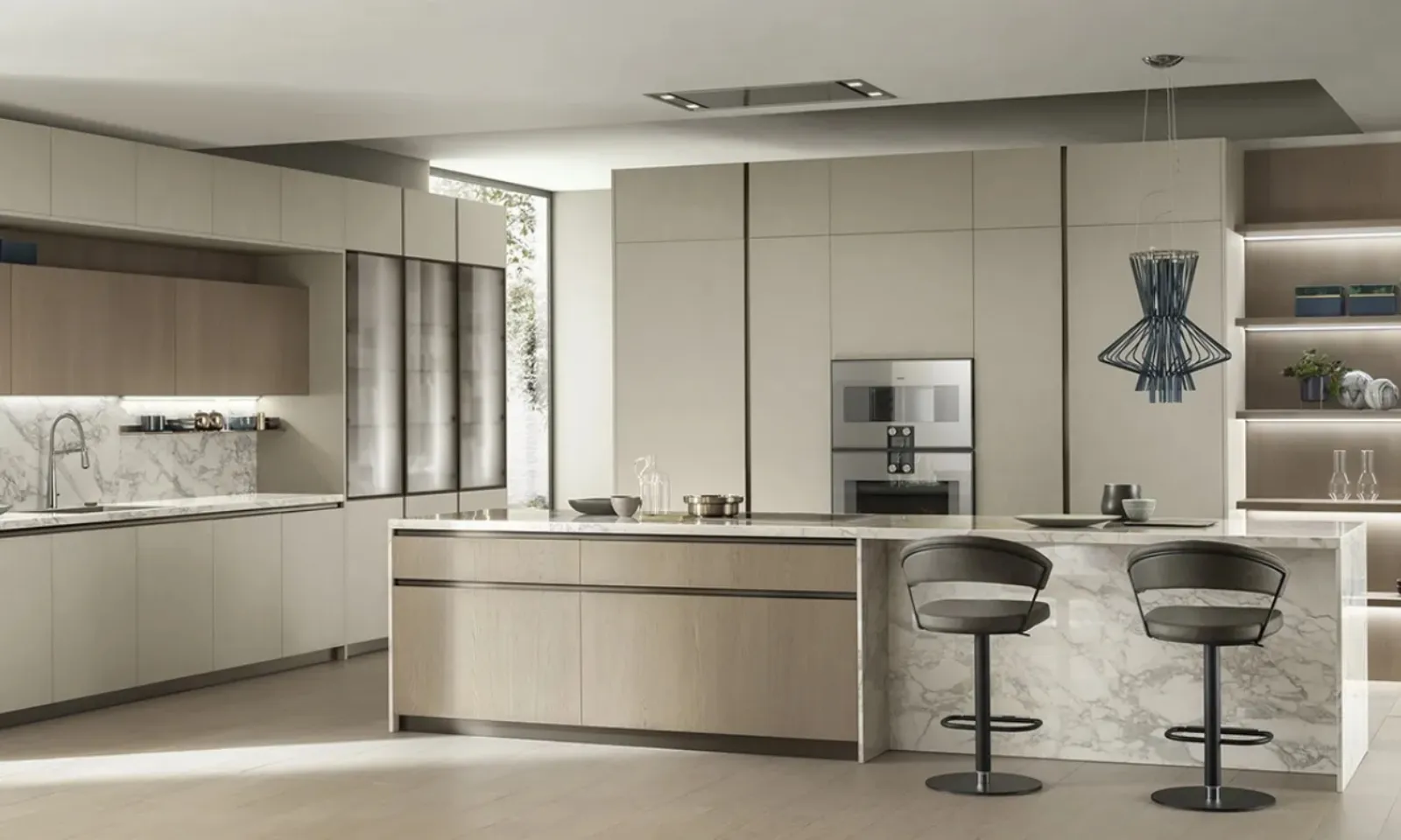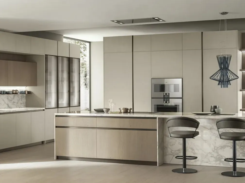 Cucine Moderne con isola: clicca e scopri una ricca gamma di soluzioni della firma Scavolini, tra cui il modello DeLinea in Biomalta Argilla Lima e Rovere Dune.