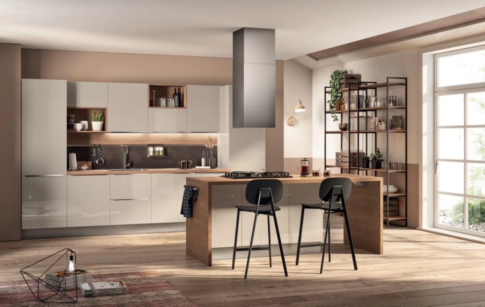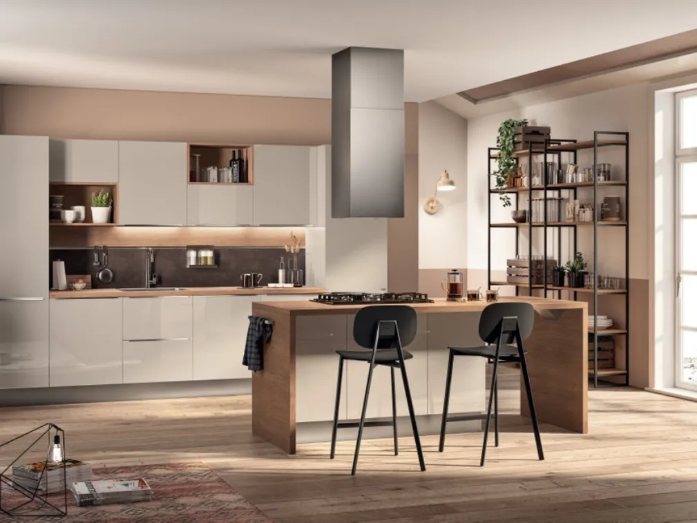 Cucine Moderne con isola: clicca e scopri un ricco catalogo di soluzioni della firma Scavolini, tra cui il modello Urban & Urban Minimal in laccato lucido Sabbia.