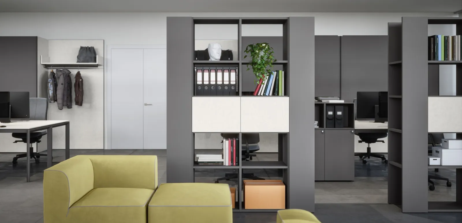 Vuoi progettare uffici operativi e direzionali? Ecco qui differenti proposte di librerie per ufficio in melaminico, come il modello Libreria 05B di Cinquanta3.